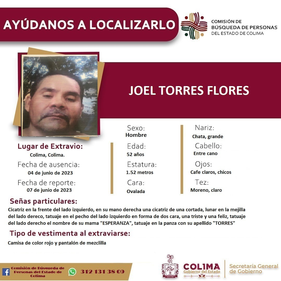 Colima, México, Avanzada (15/06/2023).- La Comisión de Búsqueda de Personas del Estado de Colima solicita la colaboración ciudadana para localizar a Joel Torres Flores, un hombre de 52 años de edad, que fue reportado como desaparecido el 7 de junio de 2023.