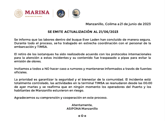 En ningún momento los operadores del puerto y los habitantes de Manzanillo estuvieron en riesgo: ASIPONA