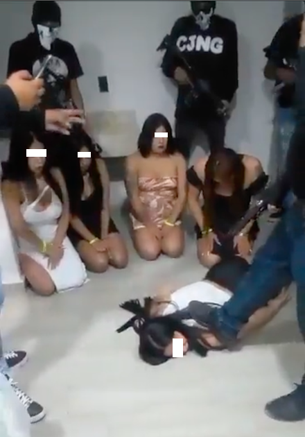 Código Negro publicó en Twitter un video en el que cinco mujeres son sometidas mientras un hombre describe las condiciones en las que deberán ejercer su oficio. Esto sucede al mismo tiempo que uno de los valientes empistolados obliga a una de las mujeres a tirarse al suelo, la pisa y le apunta a la cabeza con la pistola.