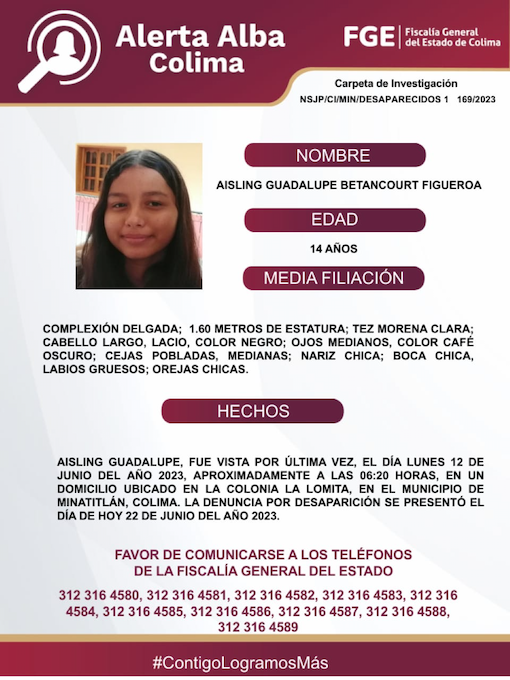 Colima, México, Avanzada (23/06/2023).- La Fiscalía General del Estado de Colima emitió una Alerta Alba tras la desaparición de una joven de 14 años en el municipio de Minatitlán. La adolescente, identificada como Aisling Guadalupe Betancourt Figueroa, fue vista por última vez el lunes 12 de junio de 2023, aproximadamente a las 06:20 horas, en un domicilio ubicado en la colonia La Lomita.