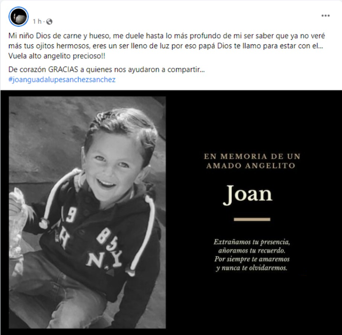 México, Avanzada (24/06/2023).- En un trágico desenlace, el cadáver de Joan Guadalupe Sánchez Sánchez, un niño de cuatro años de edad que estuvo desaparecido durante un mes, fue descubierto el día de hoy. La noticia fue confirmada por su madre a través de sus redes sociales.