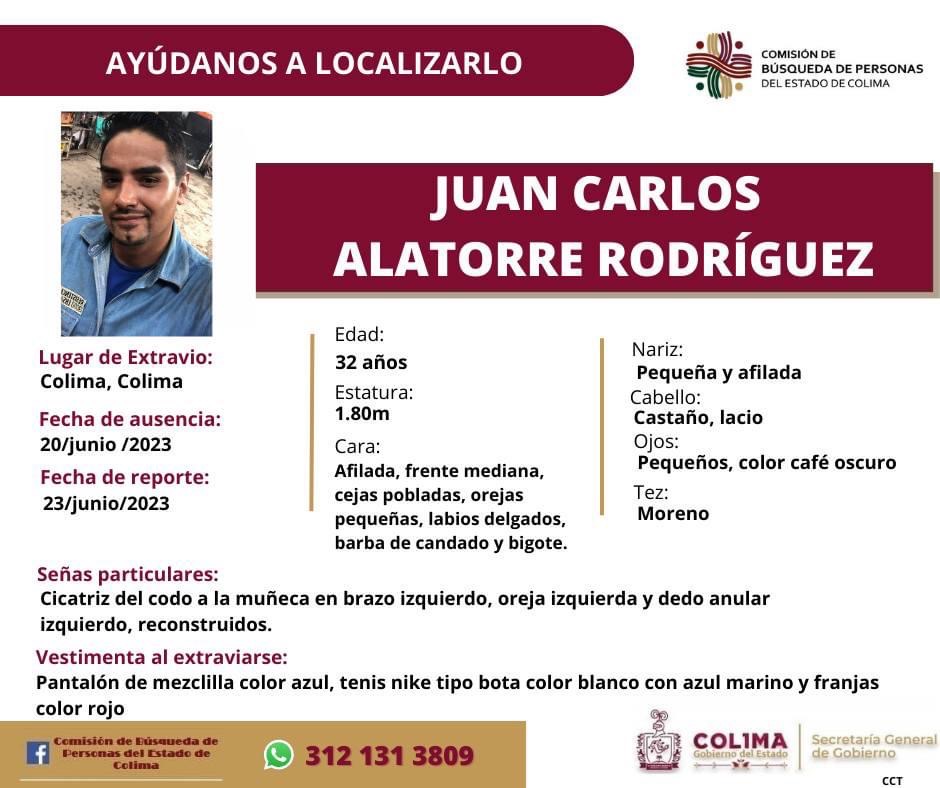 Colima, México, Avanzada (25/06/2023).- La Comisión de Búsqueda de Personas del Estado de Colima solicita la colaboración de la comunidad para localizar a Juan Carlos Alatorre Rodríguez, quien se encuentra extraviado desde el 20 de junio de 2023 en Colima, capital. Su desaparición fue reportada el 23 de junio de 2023.