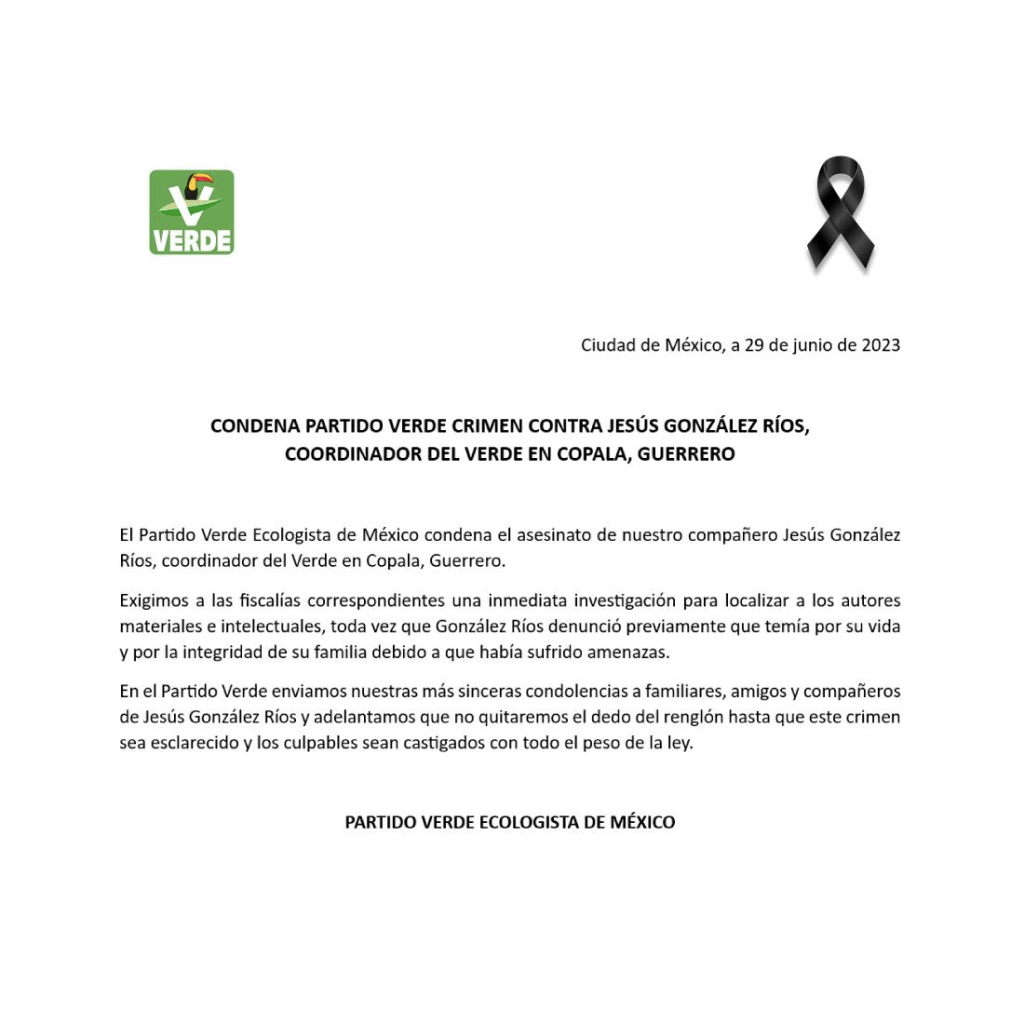 El Partido Verde Ecologista condenó el asesinato y exigió a las autoridades considerar en la investigación la denuncia que realizó previo a su muerte, además de hacer cumplir la ley y castigar a los responsables.