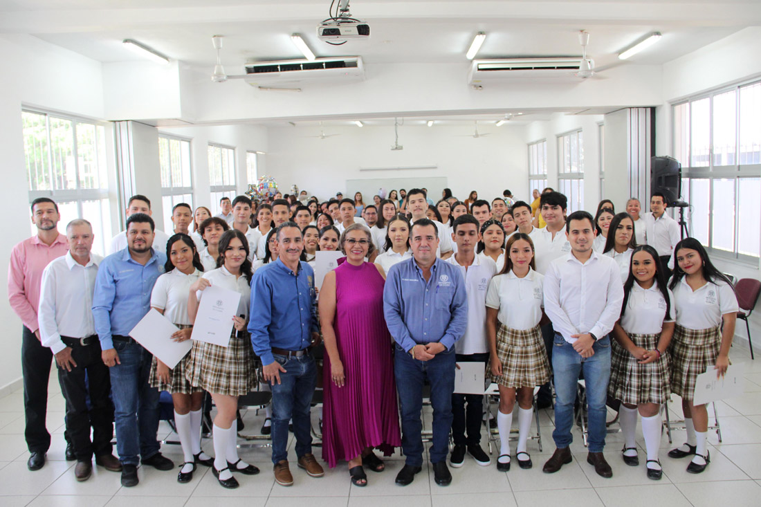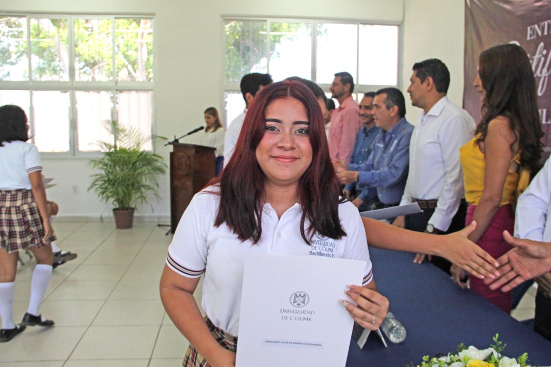 Colima, México, Comunicado (12/07/2023).- En una emotiva ceremonia, estudiantes egresados de la generación 2020-2023 de los bachilleratos 21 y 7 de la Universidad de Colima, ubicados en la cabecera municipal de Armería, recibieron su certificado de estudios de nivel medio superior. Carlos Alberto Montes Carbajal, delegado de Tecomán, entregó los certificados en representación del rector Christian Jorge Torres Ortiz Zermeño.