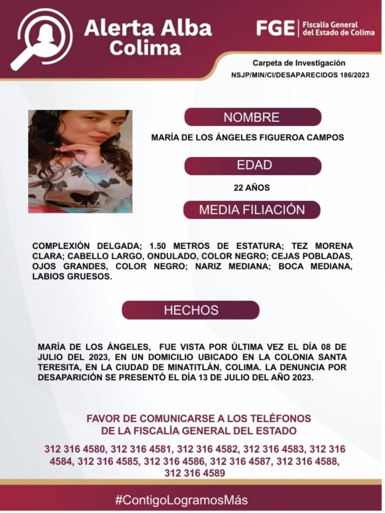 Colima, México, Avanzada (14/07/2023).- La Fiscalía General del Estado (FGE) de Colima emitió una Alerta Alba para buscar a María de los Ángeles Figueroa Campos, de 22 años de edad, quien se encuentra desaparecida desde el pasado 8 de julio.