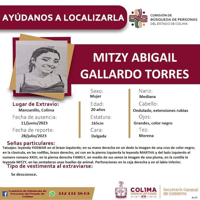 Mitzy Abigail Gallardo Torres fue vista por última vez en la localidad de Manzanillo, Colima, y desde entonces no ha habido noticias de su paradero. Sus familiares y amigos han expresado gran preocupación y angustia debido a la falta de información sobre su ausencia.