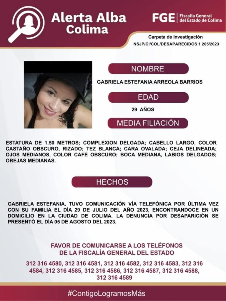 Colima, México, Avanzada (06/08/2023).- La Fiscalía General del Estado de Colima (FGE) emitió una alerta urgente tras la desaparición de Gabriela Estefanía Arreola Barrios, una joven de 29 años residente de Colima. La comunicación más reciente con su familia tuvo lugar el 29 de julio de 2023, y desde entonces no se ha tenido información sobre su paradero.