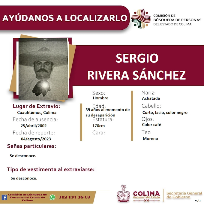 La Comisión de Búsqueda de Personas del Estado de Colima hace un llamado a la solidaridad y a la ayuda ciudadana en la localización de Sergio Rivera Sánchez. Cualquier información, por mínima que sea, puede ser de gran ayuda para resolver este caso y brindar respuestas a sus seres queridos.