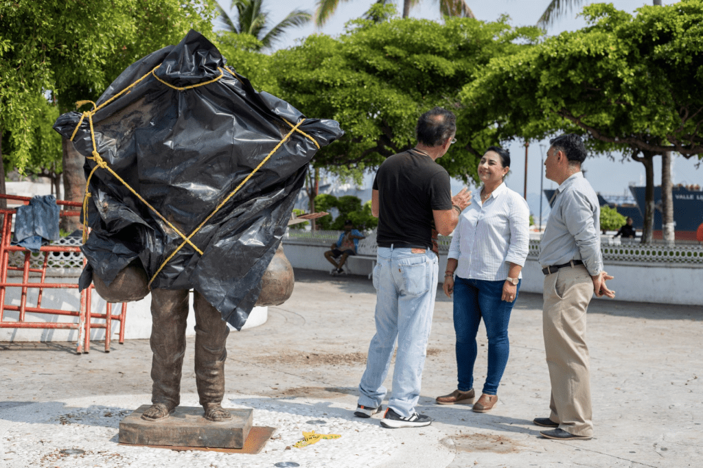 Manzanillo, México, Comunicado (10/08/2023).- Del escultor jalisciense, Rubén Hernández Guerrero, dos nuevas esculturas adornan el jardín Álvaro Obregón en el centro de la ciudad, a través del Ayuntamiento de Manzanillo se hizo la obra para que estas dos piezas fueran instaladas ahí, se trata de El Tubero; pieza de 1 metro con 80 centímetros de alto; y la otra obra LaPalma, la cual mide casi 3 metros de alto; tan sólo su personaje, tiene una altura de 1 metros con 80 centímetros de alto.
