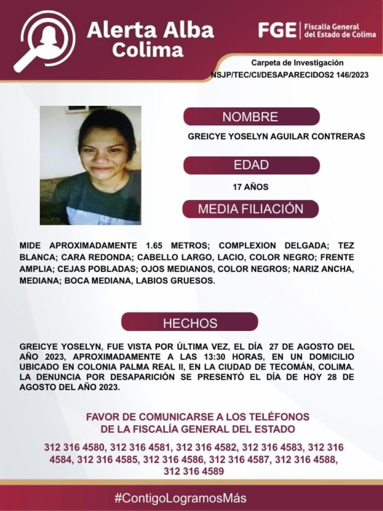 La Fiscalía General del Estado solicita la colaboración de la comunidad para localizar a Greicye Yoselyn Aguilar Contreras. Si alguien tiene información sobre su paradero o ha visto a la joven, se insta a que se comunique a los teléfonos de la Fiscalía: 312 316 4580, 312 316 4581, 312 316 4582, 312 316 4583, 312 316 4584, 312 316 4585, 312 316 4586, 312 316 4587, 312 316 4588 y 312 316 4589.