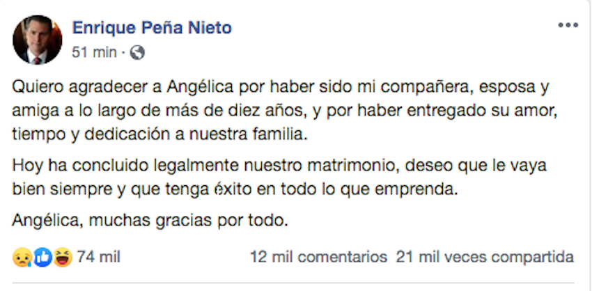 Este día, mediante su red social de Facebook, el ex presidente anunció su separación legal.