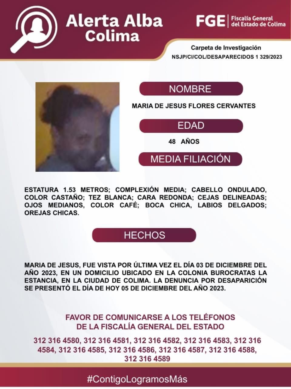 Colima, México, Avanzada (05/12/2023).- La Fiscalía General del Estado (FGE) de Colima ha activado una Alerta Alba tras la desaparición de María de Jesús Flores Cervantes, una mujer de 48 años, vista por última vez el 3 de diciembre de 2023 en un domicilio de la Colonia Burócratas La Estancia, en la ciudad de Colima.