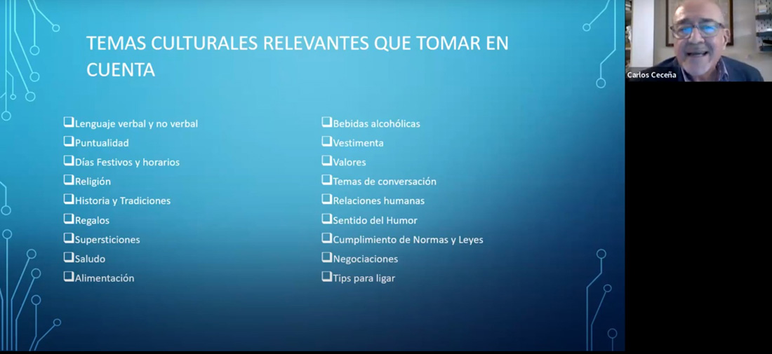 En este sentido, ofreció ejemplos del lenguaje verbal y no verbal, así como de la puntualidad que se tiene en los distintos países que ha visitado, sus días festivos y horarios, sus tradiciones y supersticiones. Incluso el saludo que tienen los mexicanos, comentó, es muy diferente al empleado en otros países.