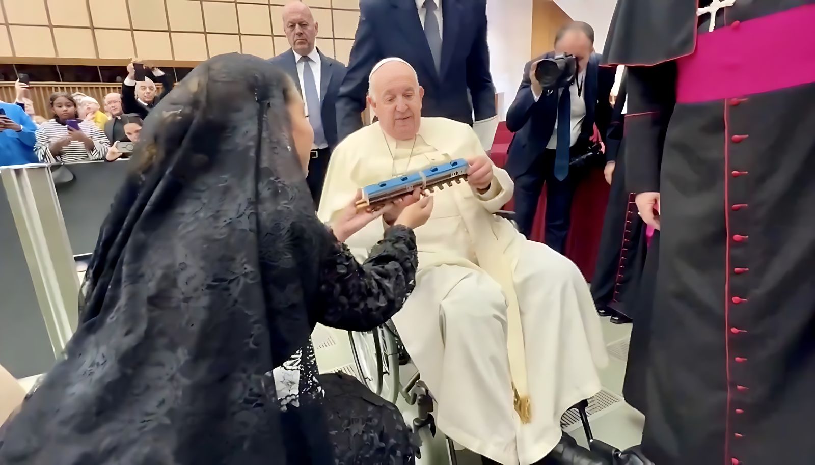 En el inter, Mara Lezama entregó un presente al titular del Estado Vaticano, presumiblemente se trataría de una artesanía regional. La mandataria mostraba una devoción propia de la más fiel seguidora de Jesucristo en la tierra, con sus expresiones faciales y genuflexiones.
