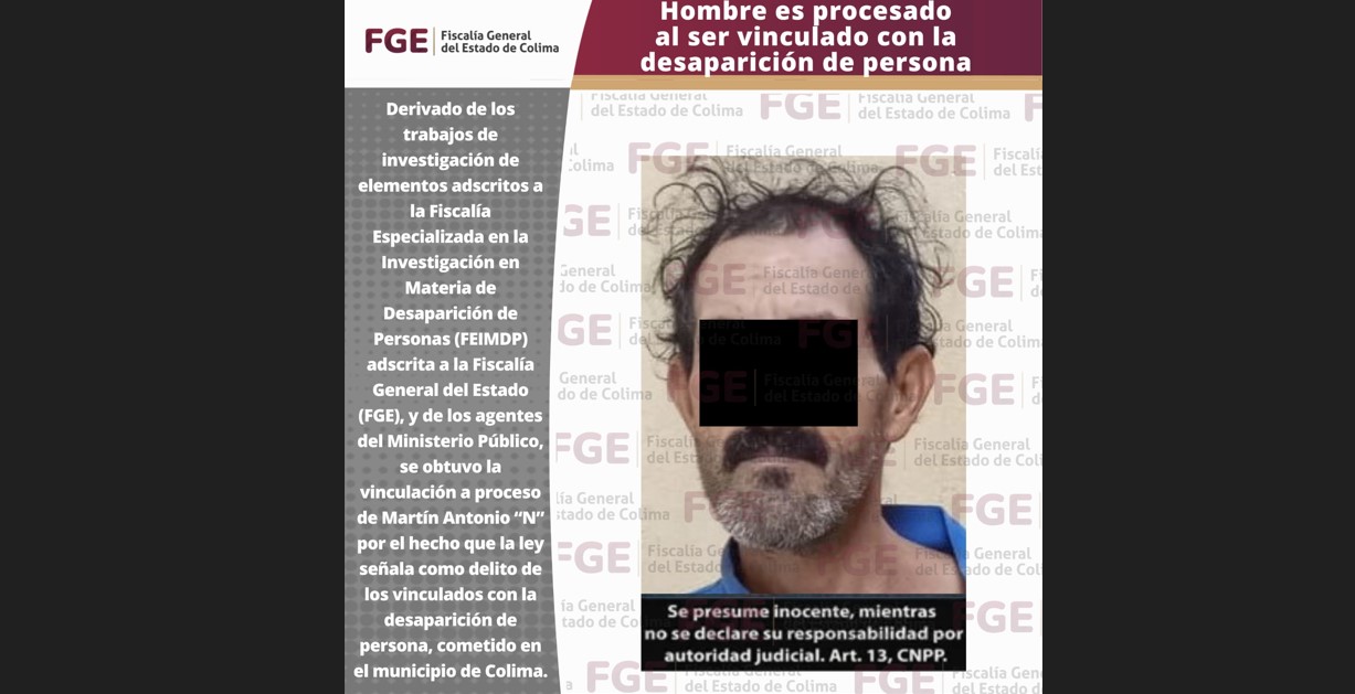 Colima, México, Avanzada (21/12/2023).- Derivado de los trabajos de investigación de la Fiscalía General del Estado (FGE), y de los agentes del Ministerio Público, se obtuvo la vinculación a proceso de Martín Antonio “N” por el hecho que la ley señala como delito de los vinculados con la desaparición de persona, cometido en el municipio de Colima.