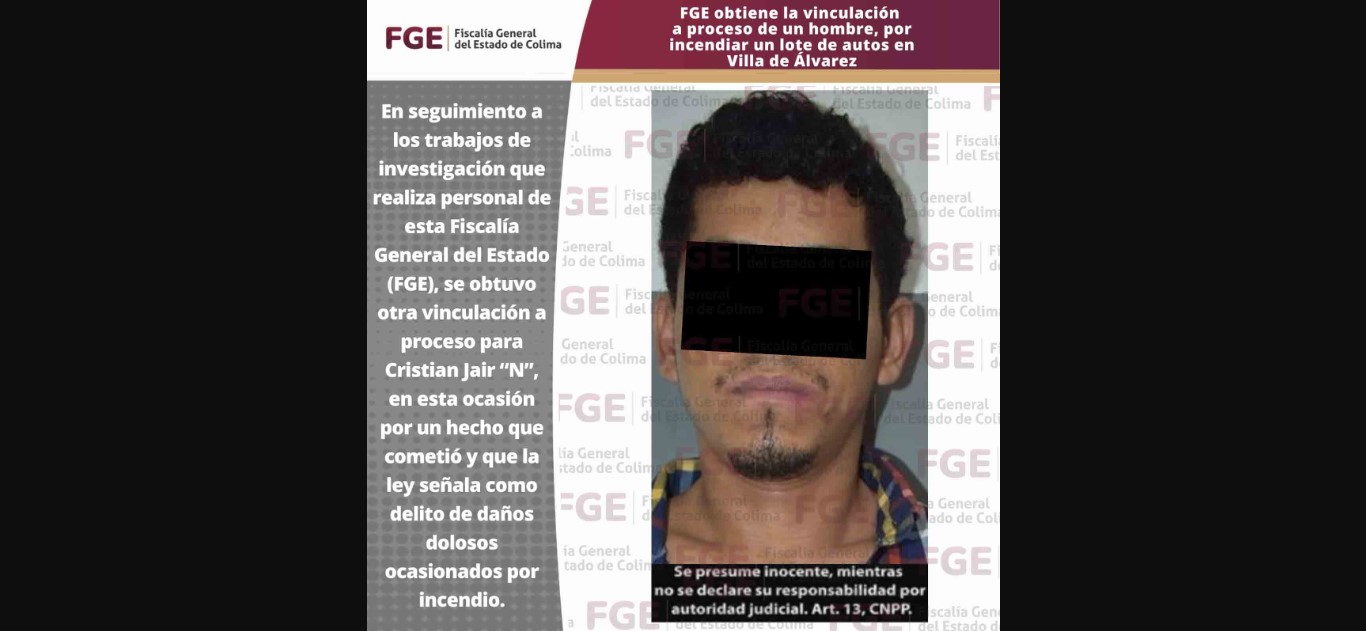 Colima, México, Avanzada (23/12/2023).- La Fiscalía General del Estado de Colima obtuvo otra vinculación a proceso para Cristian Jair “N”, en esta ocasión por un hecho que cometió y que la ley señala como delito de daños dolosos ocasionados por incendio.