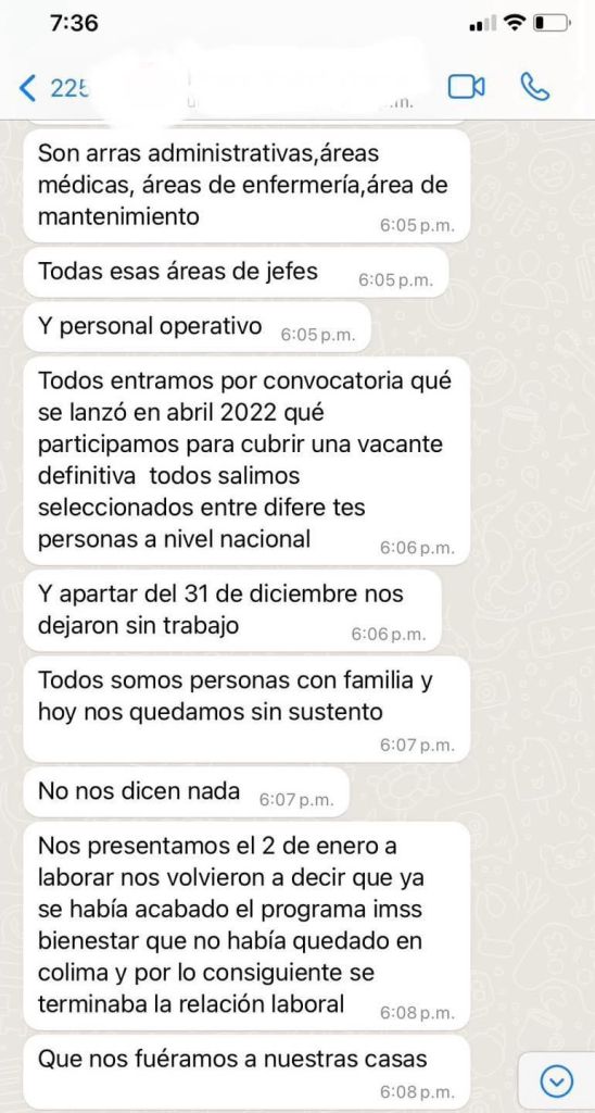 Acompañando su denuncia, el diputado compartió una captura de pantalla en la que una de las personas afectadas expresaba su preocupación: “Nos presentamos el 2 de enero a laborar, nos volvieron a decir que ya se había acabado el programa IMSS Bienestar, que no había quedado en Colima y, por lo consiguiente, se terminaba la relación laboral; que nos fuéramos a nuestras casas”.