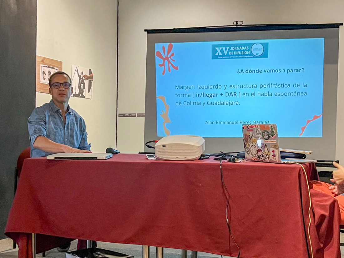 El jueves, también en el museo “Fernando del Paso”, presentaron sus avances la investigadora Cecilia Coloca Michel, con “Políticas lingüísticas en la fase 6 de la nueva escuela mexicana” y el Dr. Alan Emmanuel Barajas con “¿A dónde vamos a parar? Margen izquierdo y estructura perifrástica de la forma Ir/llegar + dar en el habla de Colima y Guadalajara”.