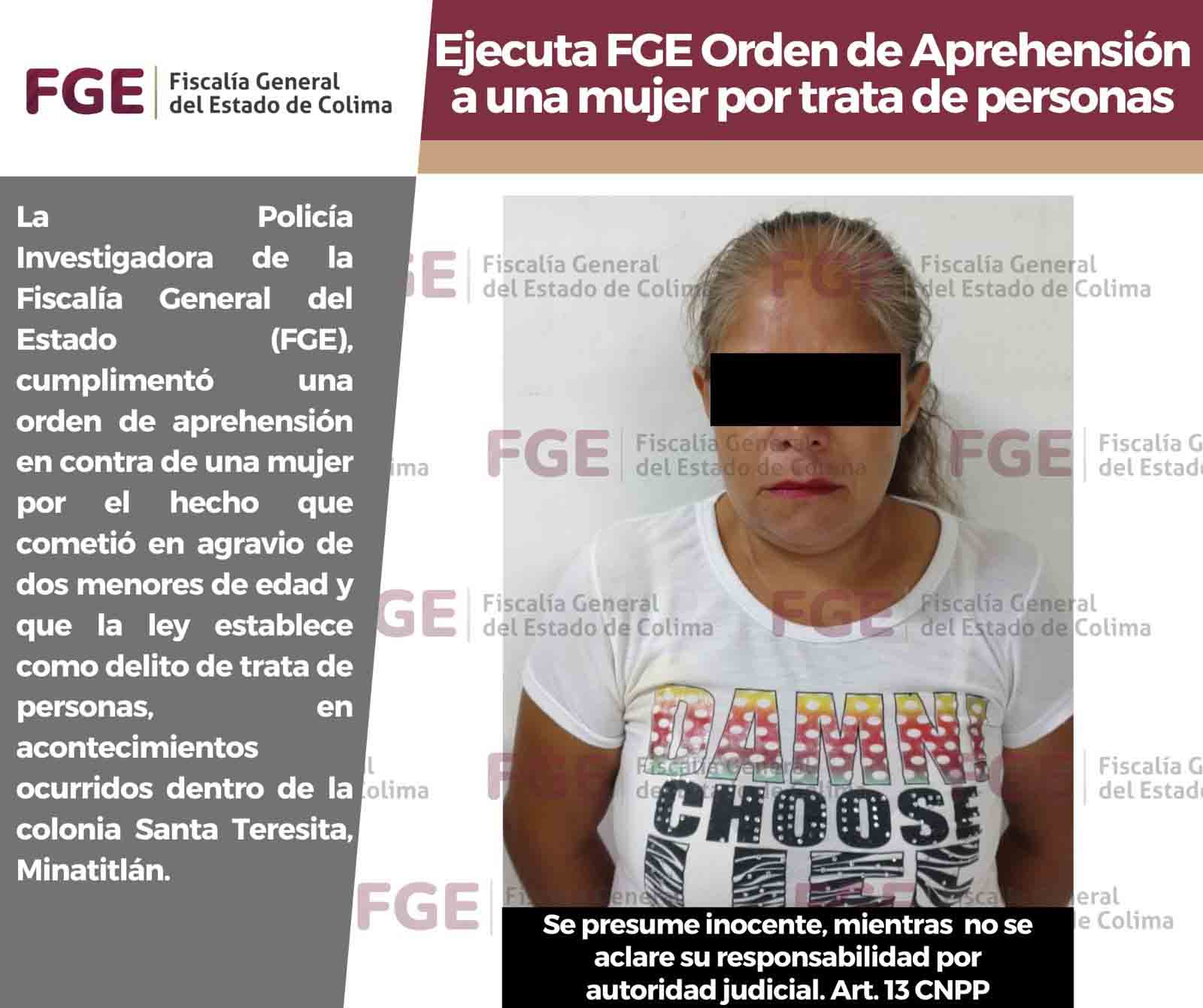 El Juez de Control emitió la orden de aprehensión por el delito de trata de personas, y la detención de la imputada se llevó a cabo en el municipio de Armería. La FGE continúa con su labor de investigar y esclarecer los actos delictivos en el Estado, buscando la captura de quienes sean señalados como responsables para llevarlos ante la justicia.