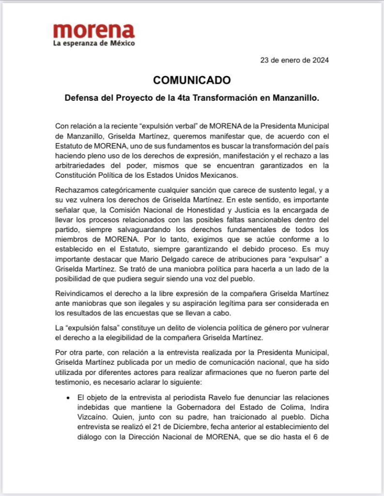 Manzanillo, México, Avanzada (23/01/2024).- En un comunicado emitido hoy, defensores del proyecto de la “cuarta transformación” en Manzanillo expresaron su rechazo a la “expulsión verbal” de Griselda Martínez por parte de Morena. En el documento, se destaca que dicha sanción carece de sustento legal y vulnera los derechos de la presidenta municipal. Además, se exige que cualquier proceso se realice conforme al Estatuto del partido y se respete el debido proceso.
