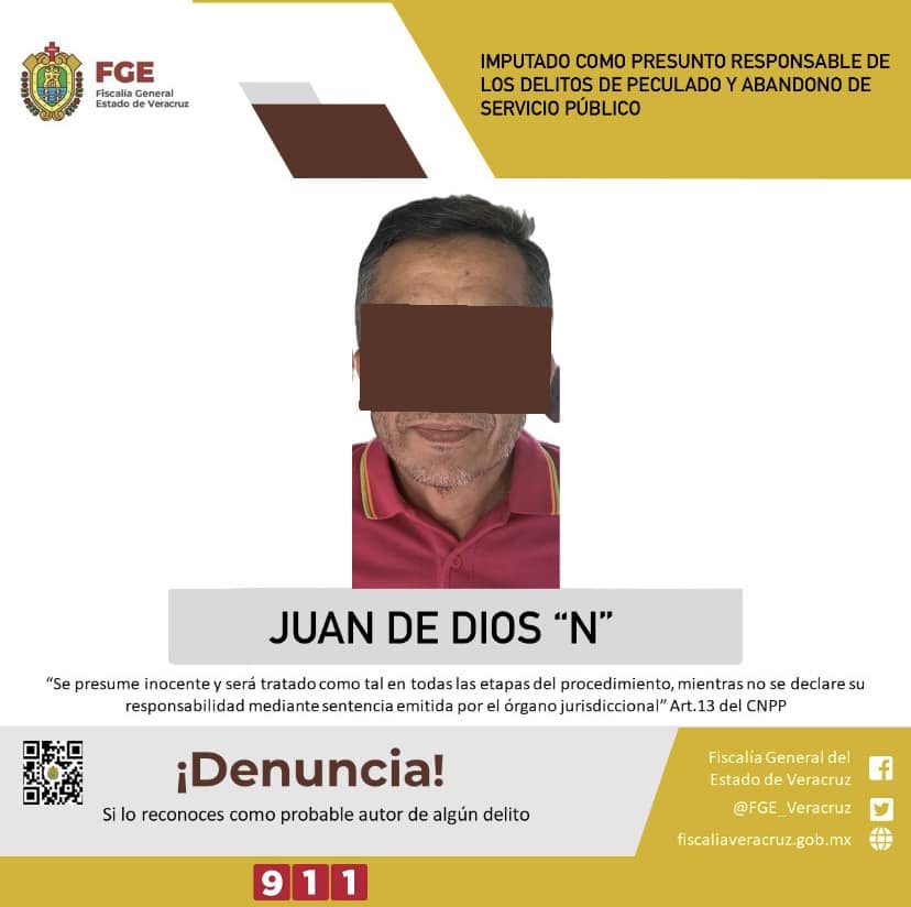 Veracruz, México, Avanzada (07/02/2024).- La Fiscalía General del Estado, informó sobre la imputación realizada por la Fiscalía Especializada en Combate a la Corrupción contra Juan de Dios “N”, quien es señalado como presunto responsable de los delitos de peculado y abandono de servicio público, en perjuicio del Colegio de Bachilleres del Estado de Veracruz (COBAEV).