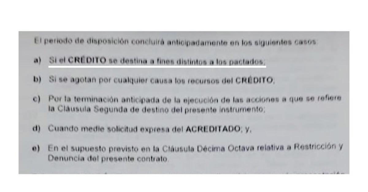 Asimismo, la cláusula quinta en su inciso a) advierte que el periodo de disposición concluirá anticipadamente “si el crédito se destina a fines distintos a los pactados”.
