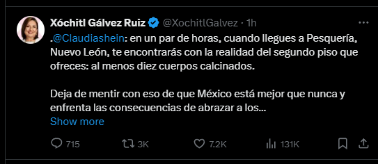 El evento ha generado reacciones en redes sociales, donde la senadora Xóchitl Gálvez publicó un mensaje dirigido a Sheinbaum, exigiendo que confronte la realidad de la violencia en México y ofrezca condolencias a las familias afectadas.