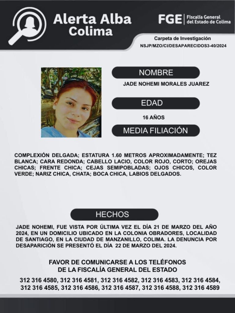 Colima, México, Avanzada (23/03/2024).- La Fiscalía General del Estado de Colima emitió una Alerta Alba tras la desaparición de Jade Nohemí Morales Juárez, de 16 años de edad, quien fue vista por última vez el día 21 de marzo del año 2024 en un domicilio ubicado en la colonia Obradores, en la localidad de Santiago, en la ciudad de Manzanillo, Colima.