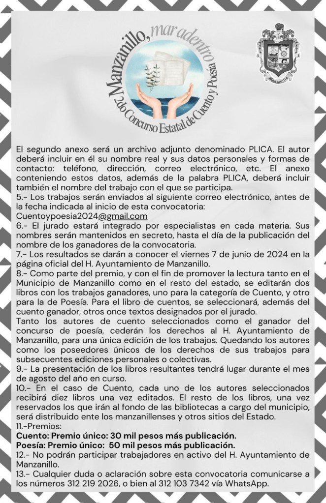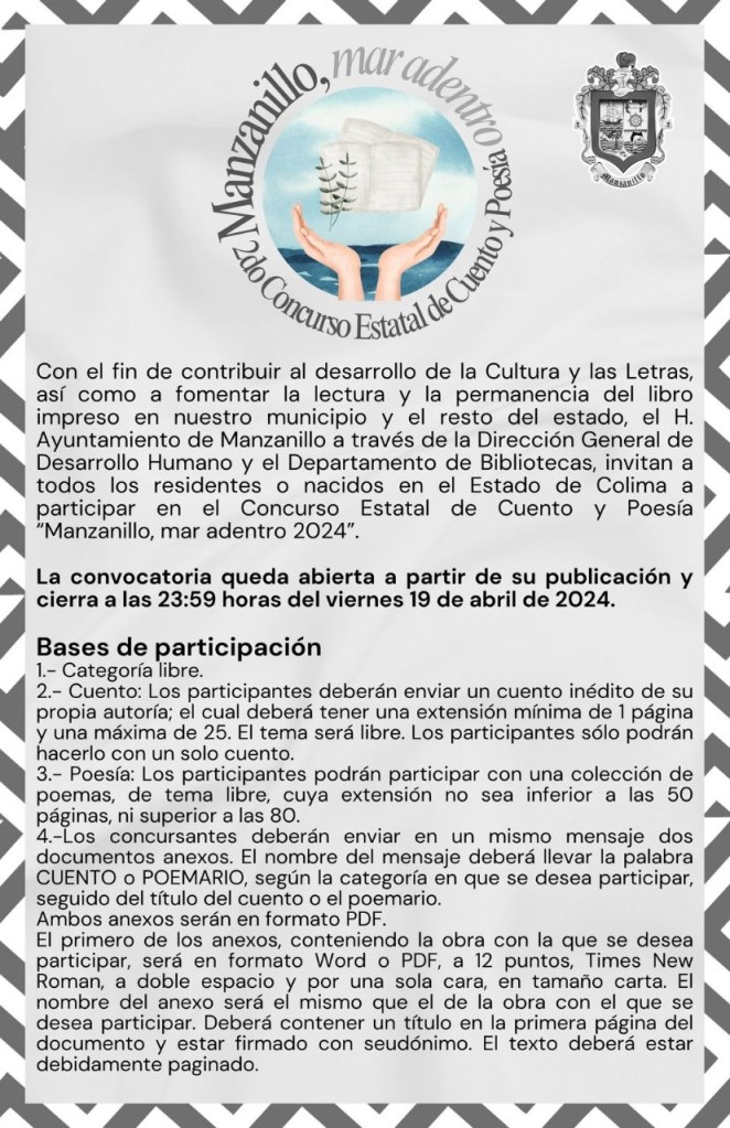 Convocan al 2° Concurso Estatal de Cuento y Poesía Manzanillo Mar Adentro 2024
