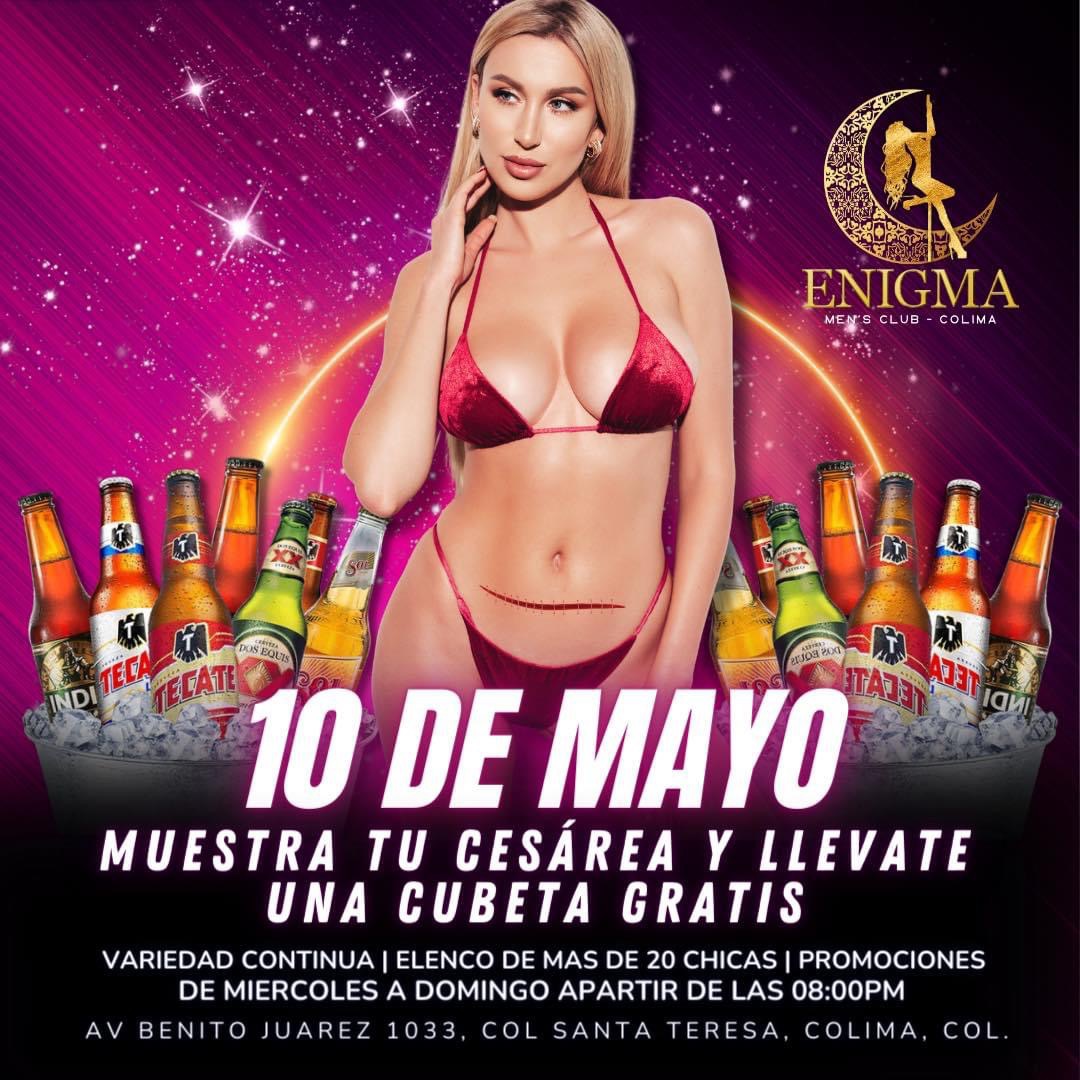 Colima, México, Avanzada (10/05/2024).- En el marco del Día de las Madres, Enigma Mens Club en Colima decidió lanzar una controvertida promoción dirigida a mujeres. A través de sus redes sociales, el establecimiento anunció una oferta especial para las “mamacitas”, donde prometían regalar una cubeta de cervezas a aquellas que mostraran evidencia de haber tenido una cesárea.
