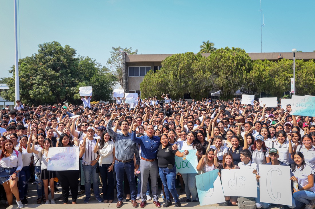 Colima, México, Avanzada (05/06/2024).- Con fundamento en los artículos 50, 51 y 52 del Reglamento Interno del H. Consejo Universitario, la mañana de este martes, centenares de estudiantes del nivel media superior y superior, encabezados por Camilo Alejandro García Morales, presidente de la Federación de Estudiantes Colimenses (FEC), se congregaron en la explanada de la rectoría para pronunciarse a favor de la reelección del Dr. Christian Jorge Torres Ortiz Zermeño, al frente de la Universidad de Colima (UdeC) para el período del 1 de febrero de 2025 al 31 de mayo de 2029.