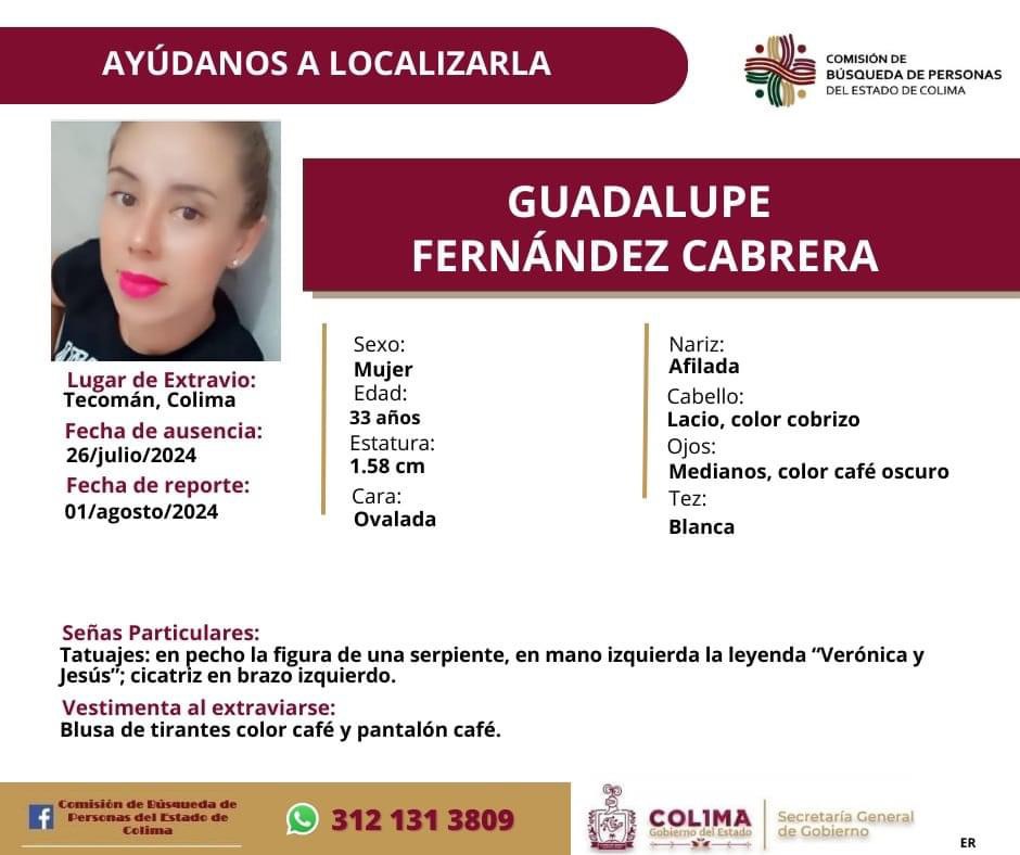 Guadalupe Fernández Cabrera desapareció el 26 de julio en Tecomán. La joven de 33 años de edad y 1.50 de estatura tiene un tatuaje en el pecho. Tiene el cabello lacio, color cobrizo y la fecha en la que se notificó a la Comisión de Búsqueda sobre su desaparición fue el primero de agosto.