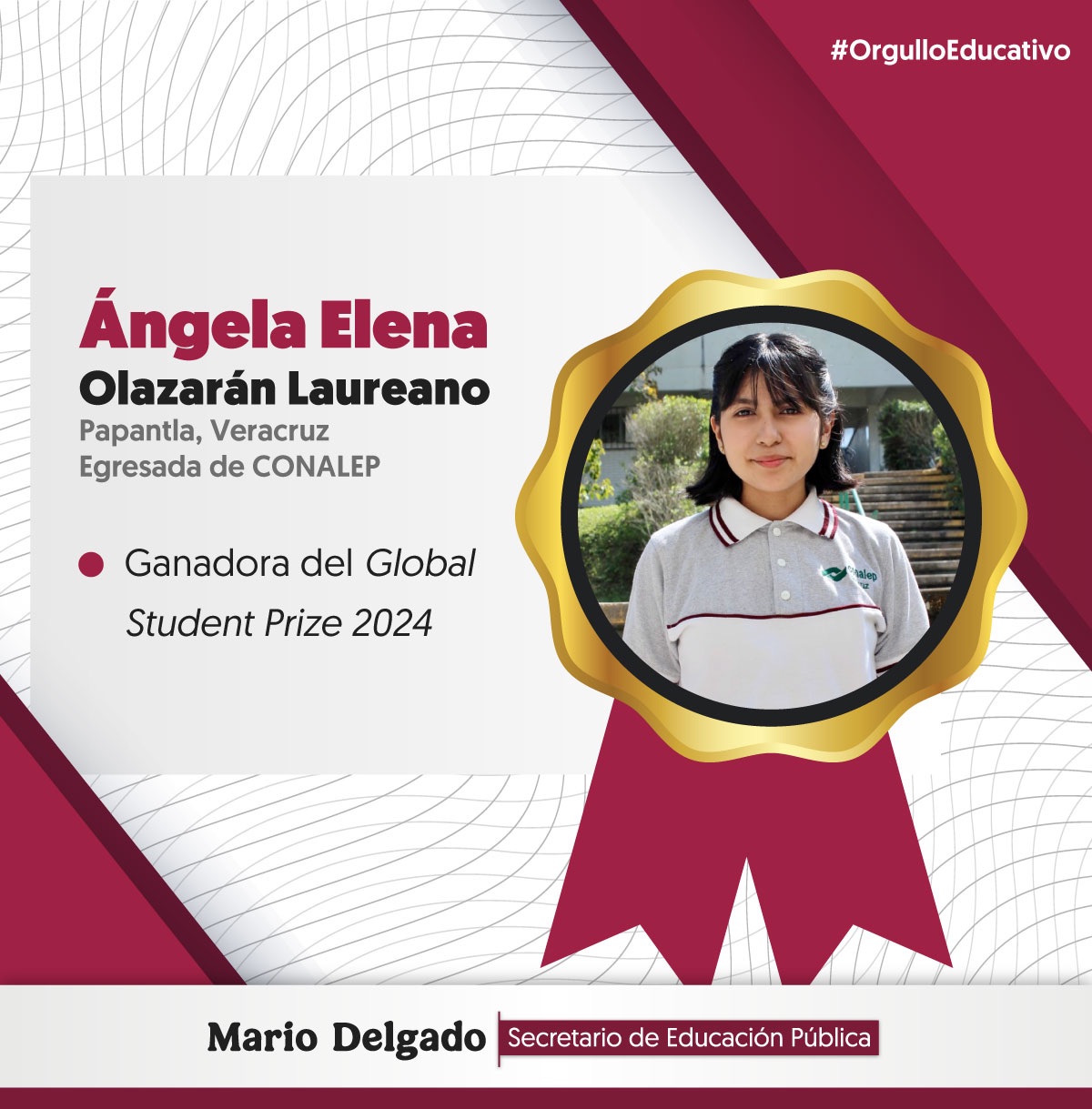 “Felicitamos a Ángela Elena Olazarán, egresada del @ConalepVeracruz, por haber ganado el Global Student Prize 2024, que la galardona como la mejor estudiante del mundo. ‘Ixtlilton’, el increíble asistente médico virtual impulsado por inteligencia artificial que desarrolló, fue el proyecto que la hizo acreedora de este reconocimiento. Es un orgullo para nuestro país. ¡Muchas felicidades!”, escribió el secretario.
