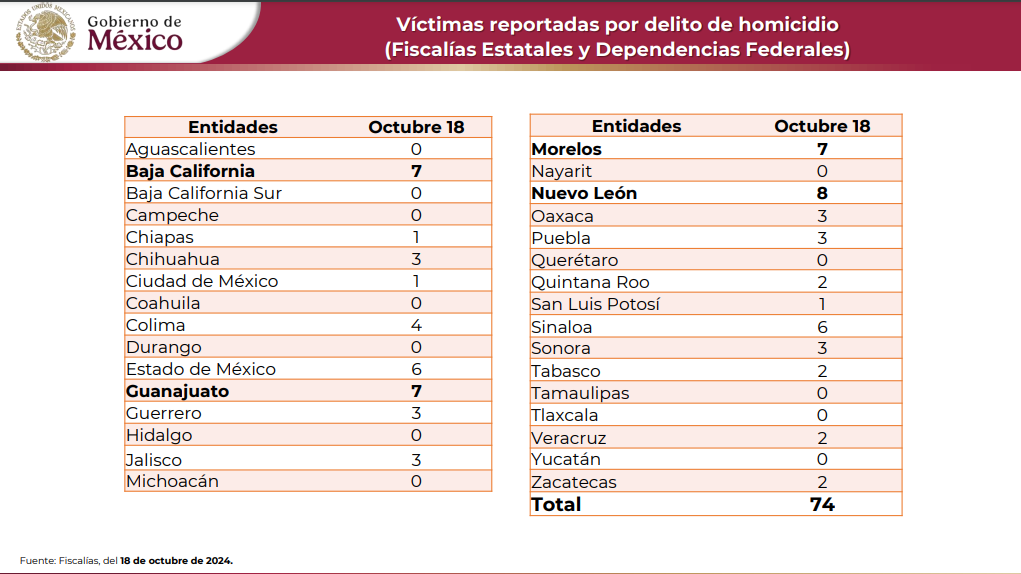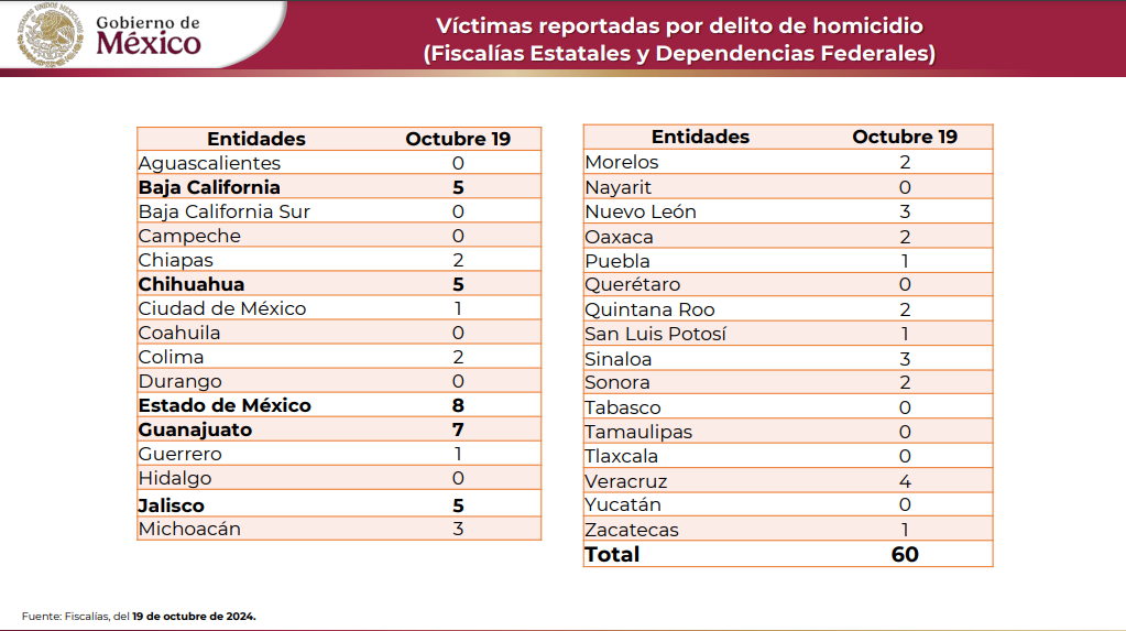 Las entidades con mayor número de homicidios fueron Jalisco con 9 homicidios dolosos, seguido por el Estado de México con 8, mientras que Chihuahua, Guanajuato, Baja California y Morelos registraron 7 asesinatos.