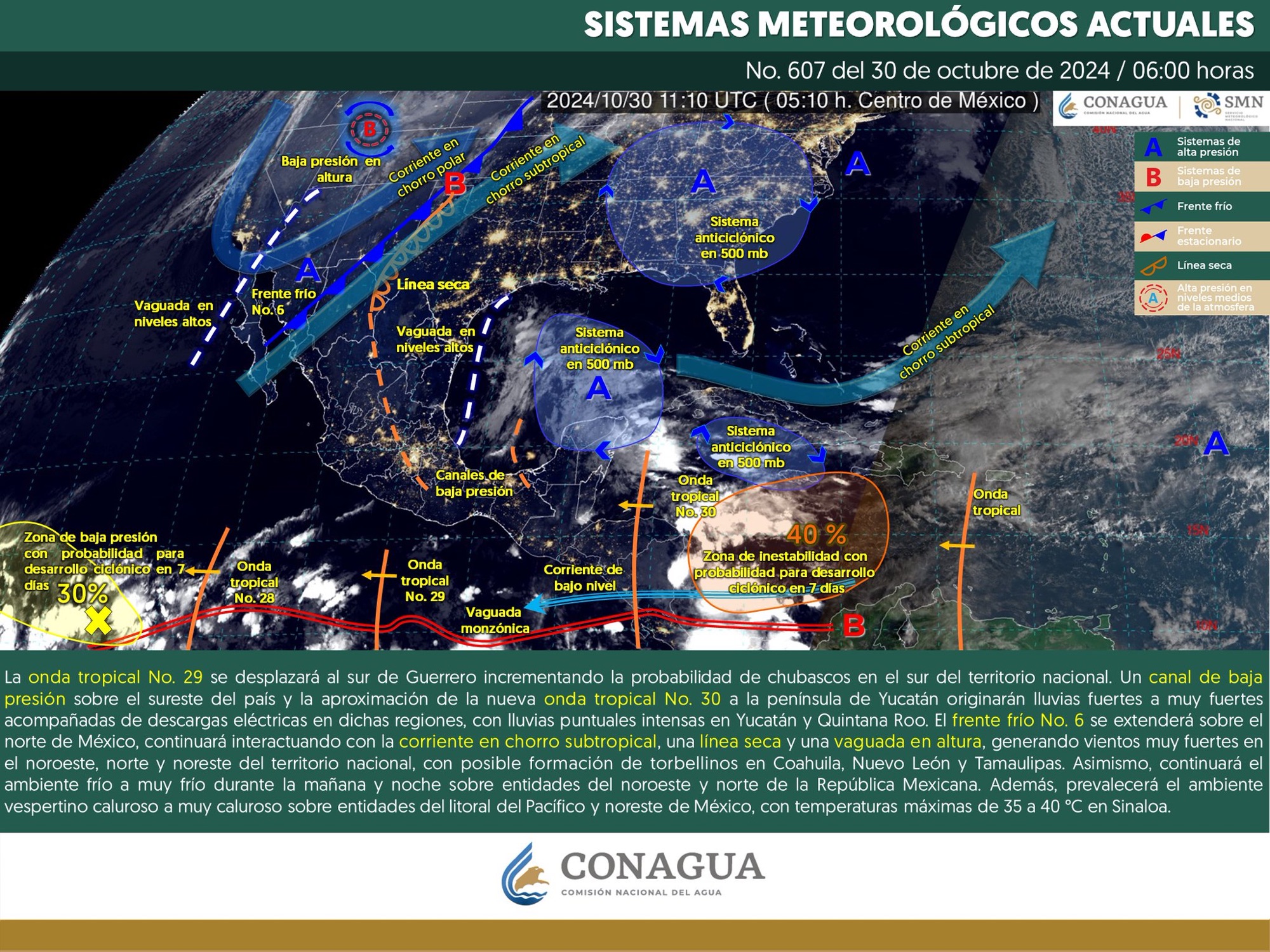 Mientras tanto, el sureste de México, en especial Yucatán y Quintana Roo, enfrentará lluvias intensas debido a la aproximación de la onda tropical No. 30 y un canal de baja presión. En el norte, el frente frío No. 6 generará vientos fuertes y bajas temperaturas, con posible formación de torbellinos en estados como Coahuila, Nuevo León y Tamaulipas.