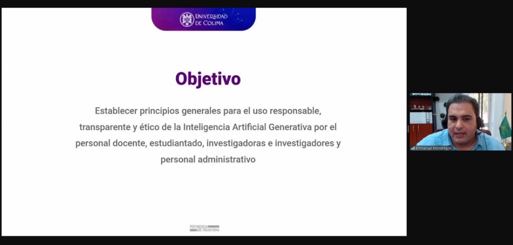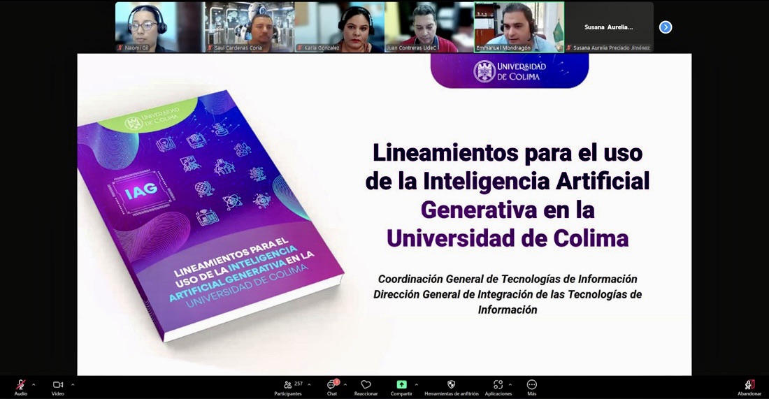 Colima, México, Comunicado (19/11/2024).- Con la intención de responder a los retos de la era digital y garantizar un uso ético y responsable de la tecnología, la Universidad de Colima (UdeC) presentó en estos días los nuevos lineamientos para la implementación de la Inteligencia Artificial Generativa (IAG). La presentación se realizó a través de una sesión virtual en la que participaron directivos, académicos y coordinadores de los tres niveles educativos.