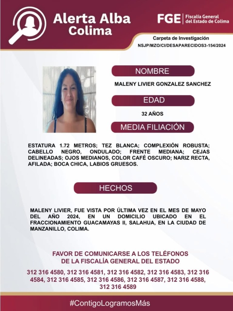 La Fiscalía General del Estado de Colima emitió una Alerta Alba para localizar a Maleny Livier González Sánchez, de 32 años, quien fue vista por última vez en mayo de 2024 en un domicilio ubicado en el fraccionamiento Guacamayas II, en Salahua, Manzanillo.