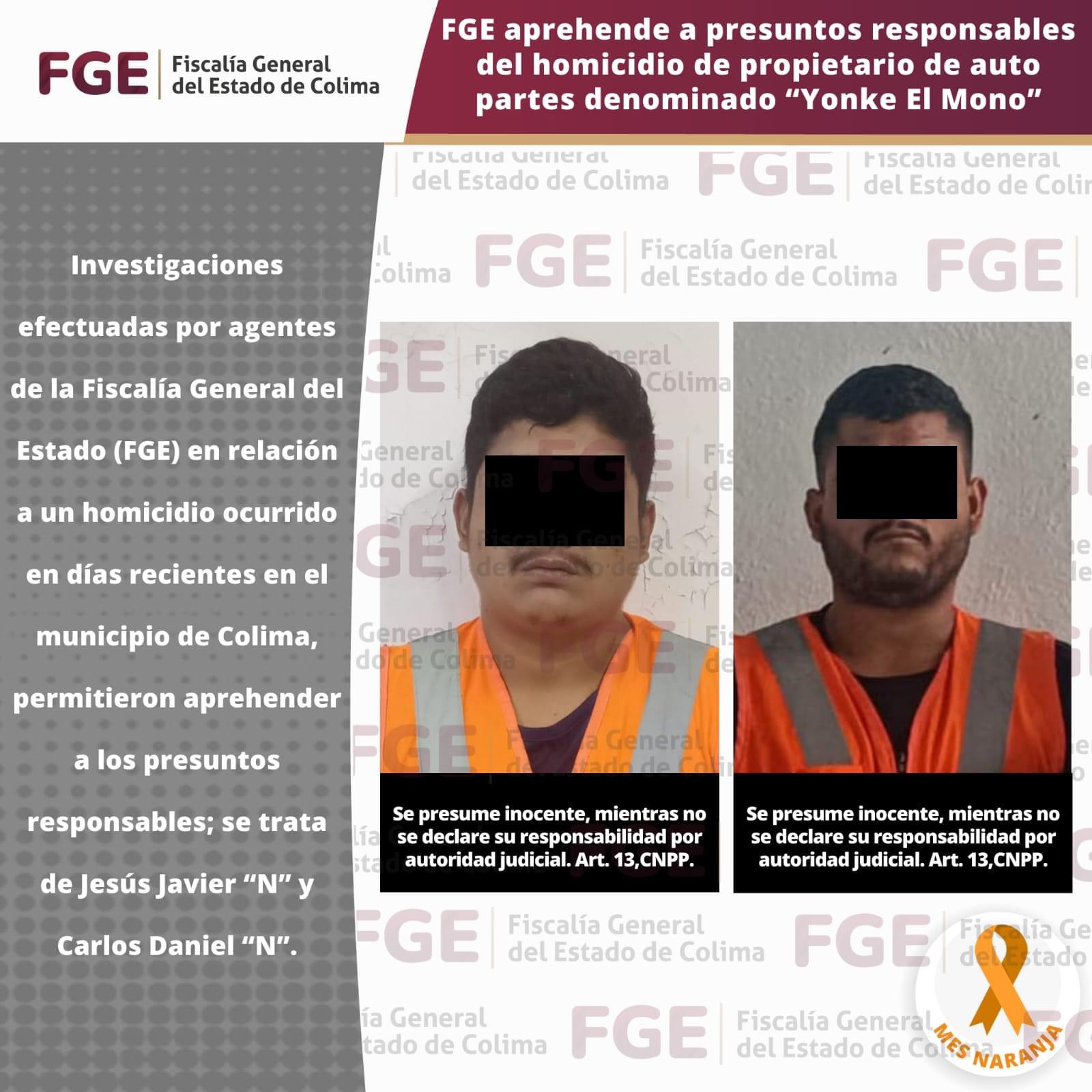 Colima, México, Avanzada (20/11/2024).- La Fiscalía General del Estado (FGE) informó sobre la captura de Jesús Javier “N” y Carlos Daniel “N”, señalados como los presuntos responsables del homicidio de Daniel “N”, propietario del negocio de autopartes “Yonke El Mono”, ubicado en la colonia La Virgencita, en el municipio de Colima.