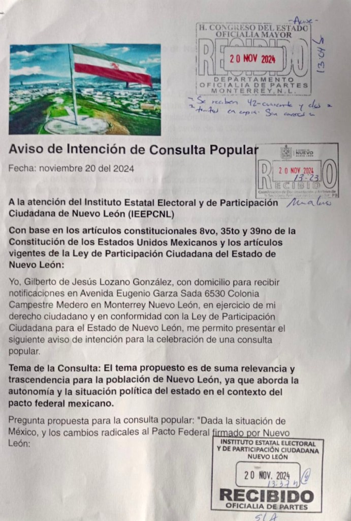 Nuevo León, México, Avanzada (21/11/2024).- Gilberto de Jesús Lozano González, ciudadano de Nuevo León, presentó formalmente un aviso de intención para realizar una consulta popular sobre la autonomía política del estado en el contexto del pacto federal mexicano. Este documento fue entregado al Congreso del Estado, al Instituto Estatal Electoral y de Participación Ciudadana de Nuevo León (IEEPCNL) y al Gobierno estatal.