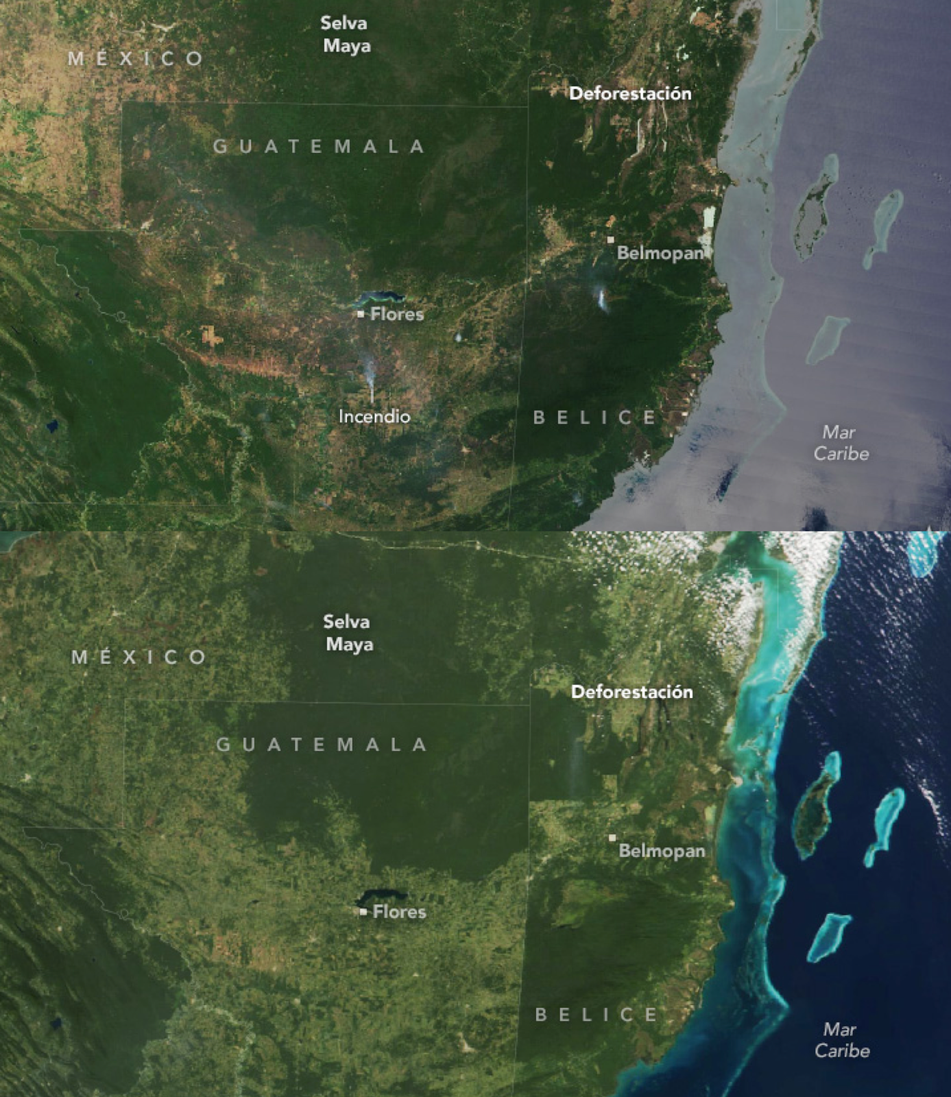Imágenes del Observatorio de la Tierra de la NASA por Wanmei Liang, utilizando datos del instrumento VIIRS del sistema EOSDIS/LANCE de la NASA, GIBS/Worldview y el satélite Suomi de la Alianza Nacional de Satélites Polares, con datos del instrumento MODIS del sistema EOSDIS/LANCE y GIBS/Worldview de la NASA, y datos de pérdida de bosques de la Universidad de Maryland. La imagen de archivo histórico de México y Guatemala fue publicada originalmente en este sitio web en 2004. Reportaje por Adam Voiland.
