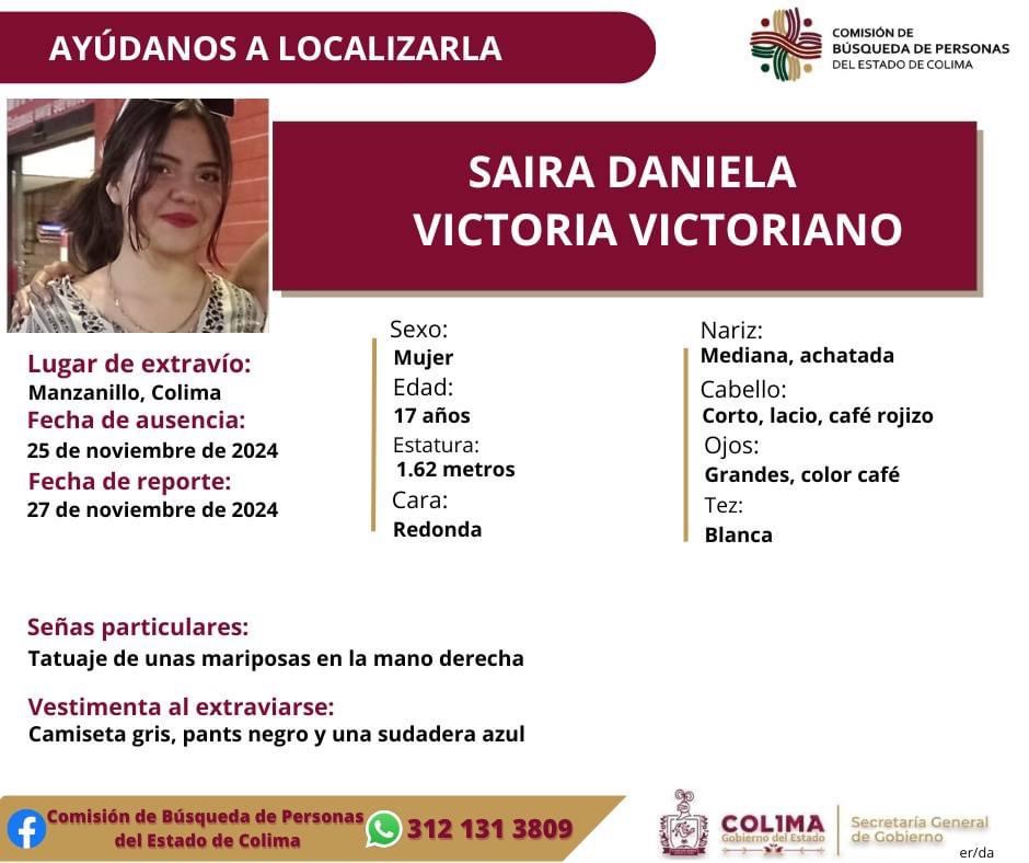 Colima, México, Avanzada (27/11/2024).- La Comisión de Búsqueda de Personas del Estado de Colima solicita el apoyo de la ciudadanía para localizar a Saira Daniela Victoria Victoriano, una joven de 17 años desaparecida en el municipio de Manzanillo.
