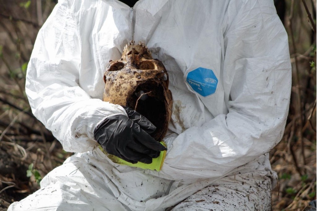 Una perito sostiene el cráneo de Raúl, hallado en una fosa del Cerro de la Cruz, junto a la ciudad de Jacona.