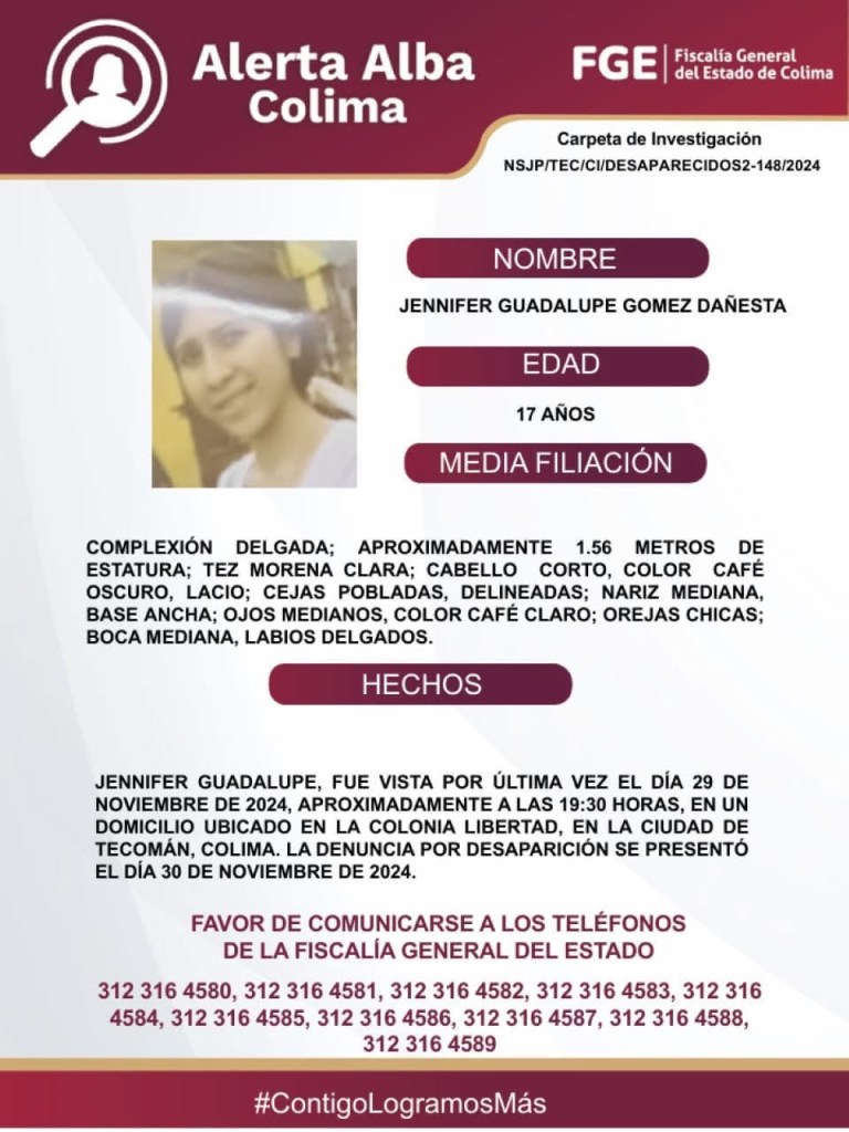 Colima, México, Avanzada (01/12/2024).- La Fiscalía General del Estado de Colima activó una Alerta Alba para localizar a Jennifer Guadalupe Gómez Danesta, de 17 años, quien fue reportada como desaparecida.