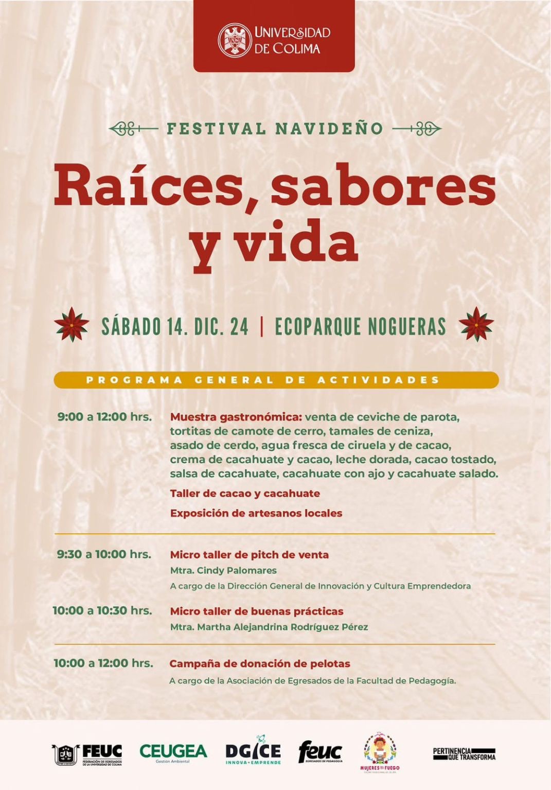 Colima, México, Comunicado (11/12/2024).- Este sábado 14 de diciembre, la Universidad de Colima invita a la comunidad a disfrutar del festival navideño “Raíces, Sabores y Vida”, un evento único que combina la tradición y los sabores locales con la reflexión sobre el impacto ambiental. El encuentro se llevará a cabo en el Ecoparque de Nogueras, en las instalaciones del Centro Universitario de Gestión Ambiental (CEUGEA), de 9 de la mañana a 12 de la tarde.
