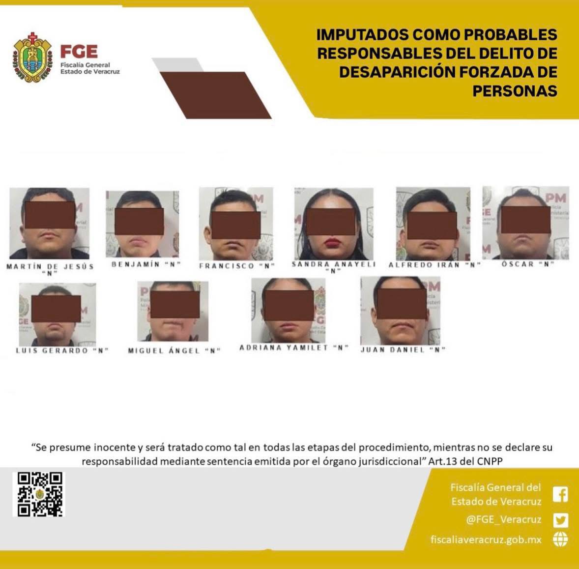 Los imputados, identificados como Martín de Jesús “N”, Benjamín “N”, Francisco “N”, Sandra Anayeli “N”, Alfredo Irán “N”, Óscar “N”, Luis Gerardo “N”, Miguel Ángel “N”, Adriana Yamilet “N” y Juan Daniel “N”, enfrentan cargos relacionados con la desaparición de dos víctimas cuya identidad permanece reservada.