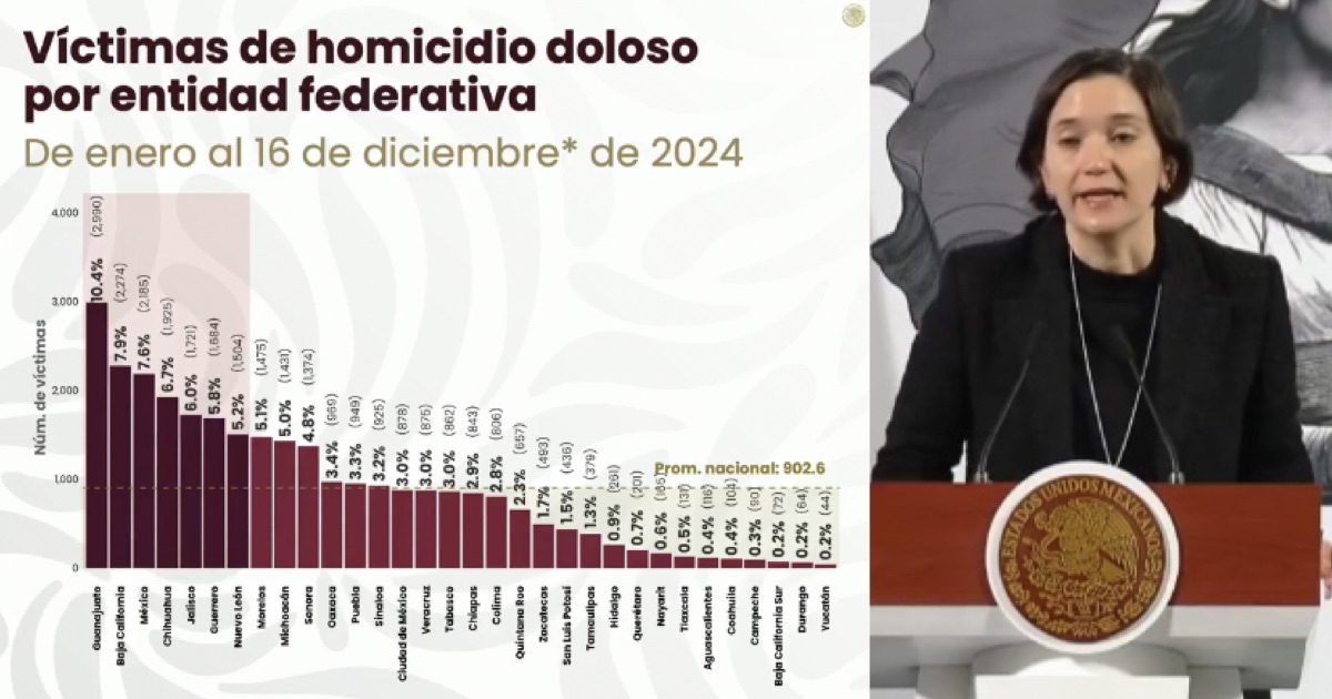 Avanzada (17/12/2024).- En su más reciente reporte sobre la incidencia delictiva, Marcela Figueroa, titular del Secretariado Ejecutivo del Sistema Nacional de Seguridad Pública, informó que siete estados concentran el 46.6% de los homicidios dolosos registrados entre enero y el 16 de diciembre de este año.