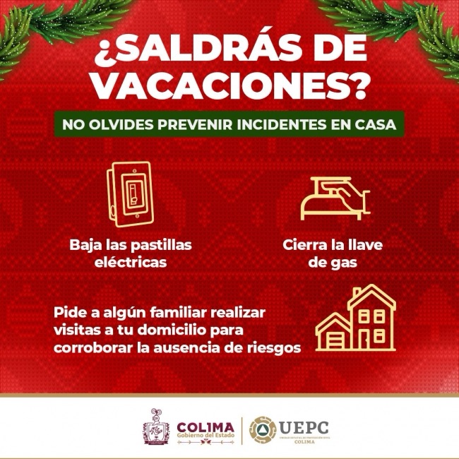 Colima, México, Comunicado (21/12/2024).- Durante esta temporada vacacional decembrina, la Unidad Estatal de Protección Civil (UEPC) del Gobierno del Estado de Colima exhorta a las y los colimenses a tomar medidas preventivas, en caso de salir de casa.