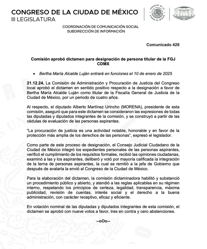 México, Avanzada (21/12/2024).- En una sesión que duró menos de 15 minutos, la Comisión de Justicia del Congreso local aprobó, con 9 votos a favor y 3 en contra, el dictamen que posiciona a Bertha María Alcalde como la mejor candidata de la terna para ocupar la Fiscalía General de Justicia de la Ciudad de México.