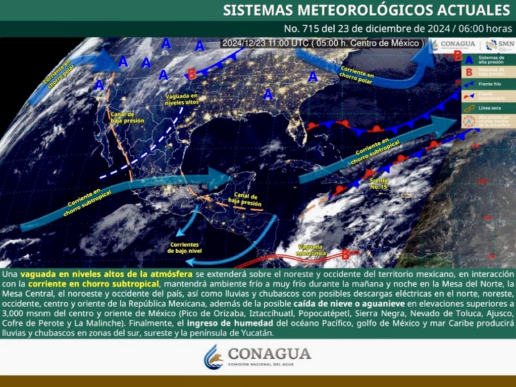 Colima, México, Avanzada (23/12/2024).- Una vaguada en niveles altos de la atmósfera, combinada con la corriente en chorro subtropical, generará condiciones de lluvia y temperaturas variables en varias regiones del país, incluido Colima.