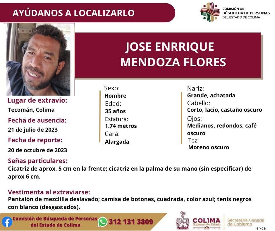 Colima, Mexico, Avanzada (11/01/2025).- La Comisión de Búsqueda de Personas del Estado de Colima solicita el apoyo de la ciudadanía para localizar a José Enrrique Mendoza Flores, de 35 años, quien fue visto por última vez el 21 de julio de 2023 en el municipio de Tecomán.